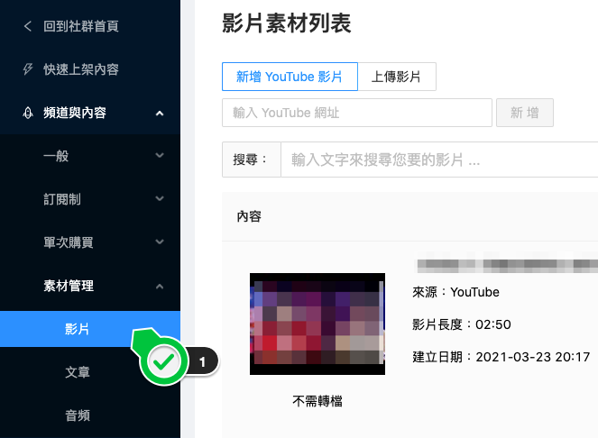 圖、首先到素材管理上傳新的影片或 YouTube 連結