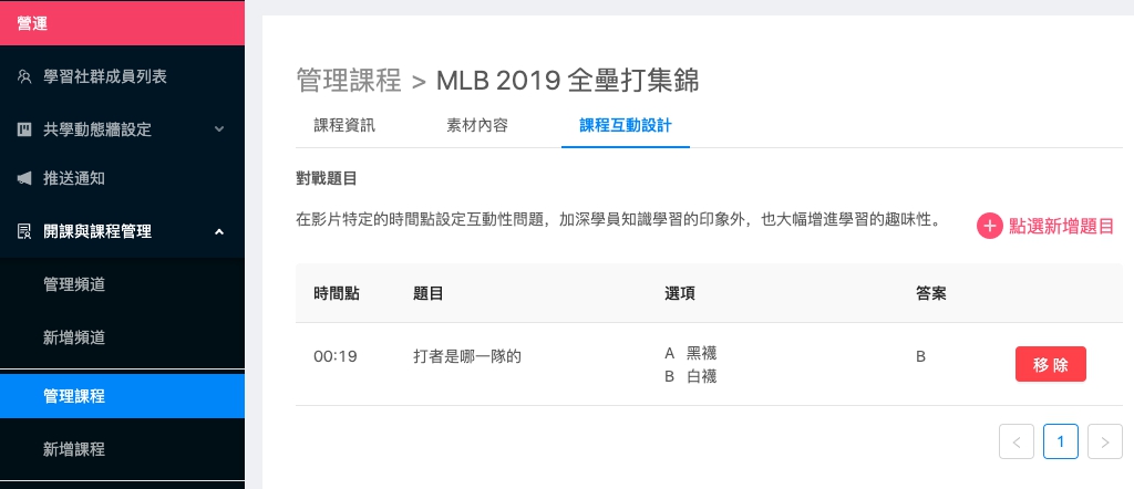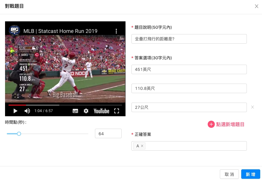 在影片右方,輸入題目說明、答案選項、選擇正確答案(可多選),完成後按下新增。