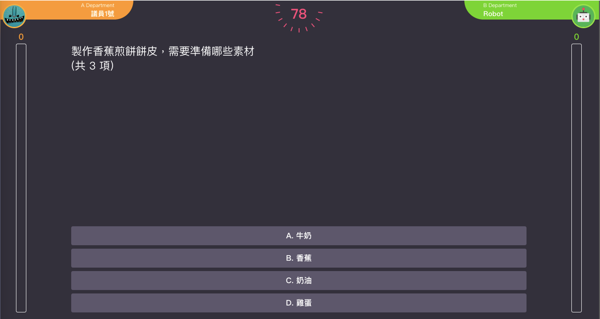 老師可以設計對戰問題,下方答案可以複選。畫面左側是自己,右側是隨機的挑戰者。上方的數字是倒數計時器,對戰資料會是來自其他用戶真實答題的時間及分數,搶答時間愈短,可以獲得愈高的積分!