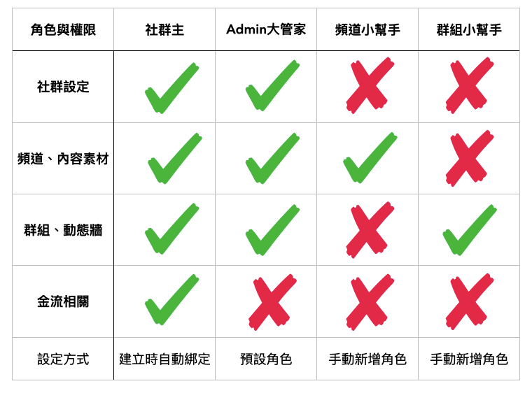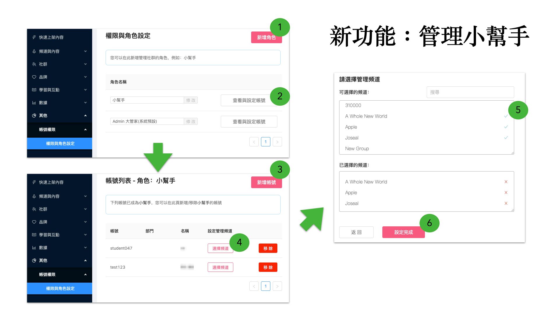 社群主可以將現有的頻道內容、群組動態牆,指派給現有的成員管理。